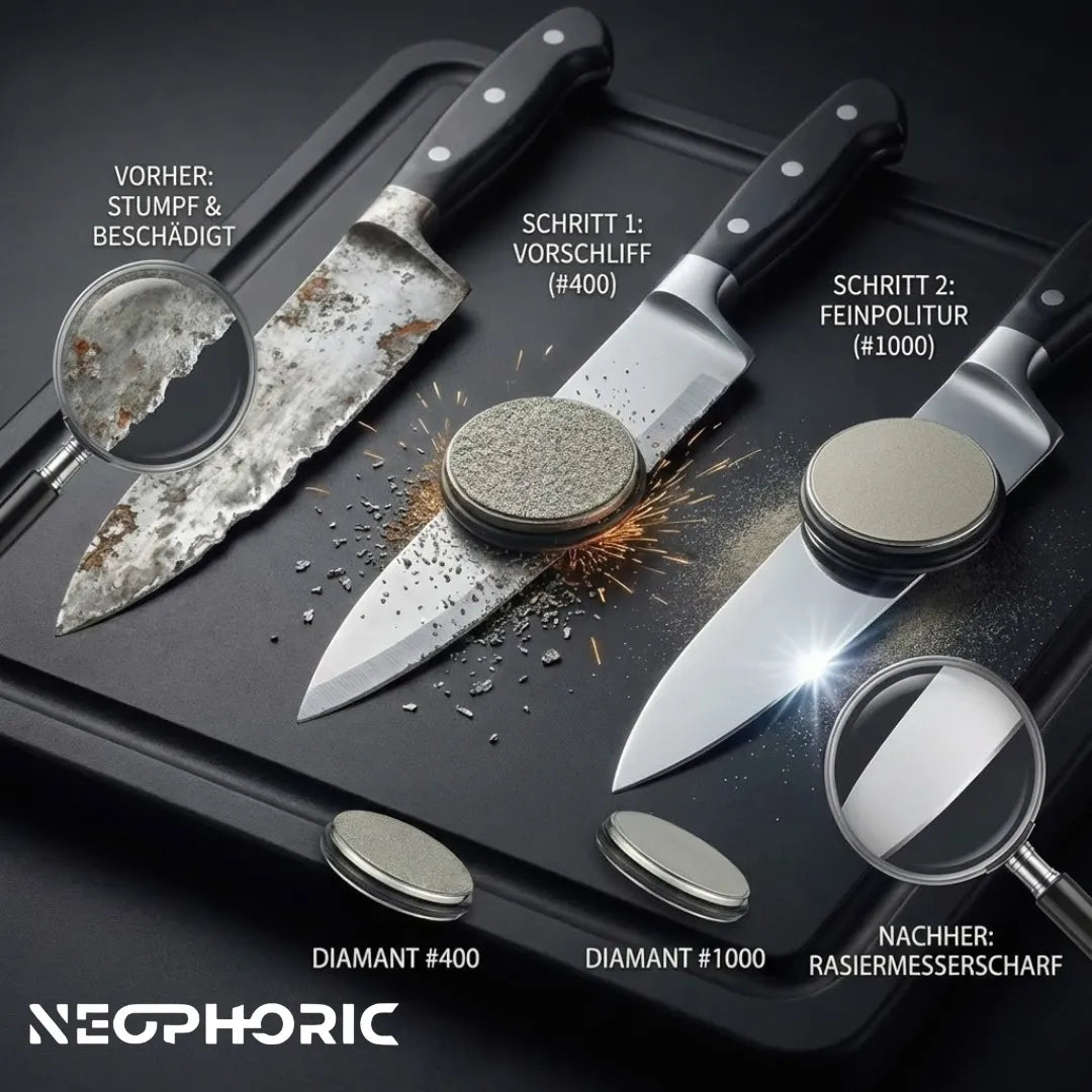 Absolut. Im Gegensatz zu elektrischen Schärfern oder Wetzstählen trägt die Diamantscheibe das Material sehr schonend und gleichmäßig ab. Es entsteht keine Hitze, die die Härtung des Stahls beschädigen könnte. Deine teuren Messer sind hier in sicheren Händen.
